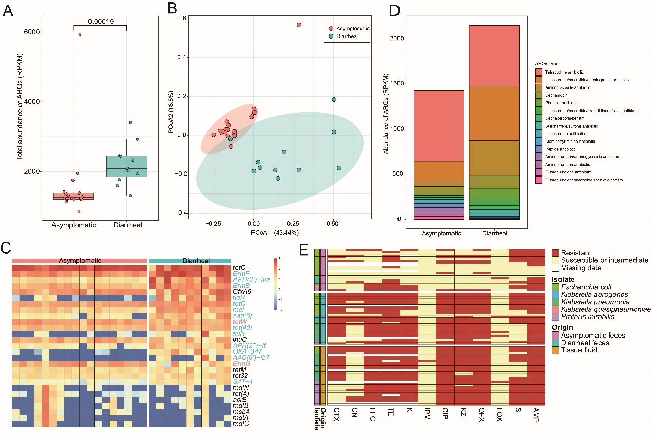 图2慢性腹泻猕猴和无症状猕猴肠道微生物的抗生素耐药性。(A)抗生素耐药基因的总丰度比较(p-value < 0.001)。(B)基于抗生素耐药基因丰度的Bray-Curtis距离PCoA图(adonis,R2 = 0.26893,P = 0.001)。(C)耐药基因的丰度比较。(D)耐药基因的主要类型。(E)从粪便和组织液中分离出的菌株对抗生素的耐药性。