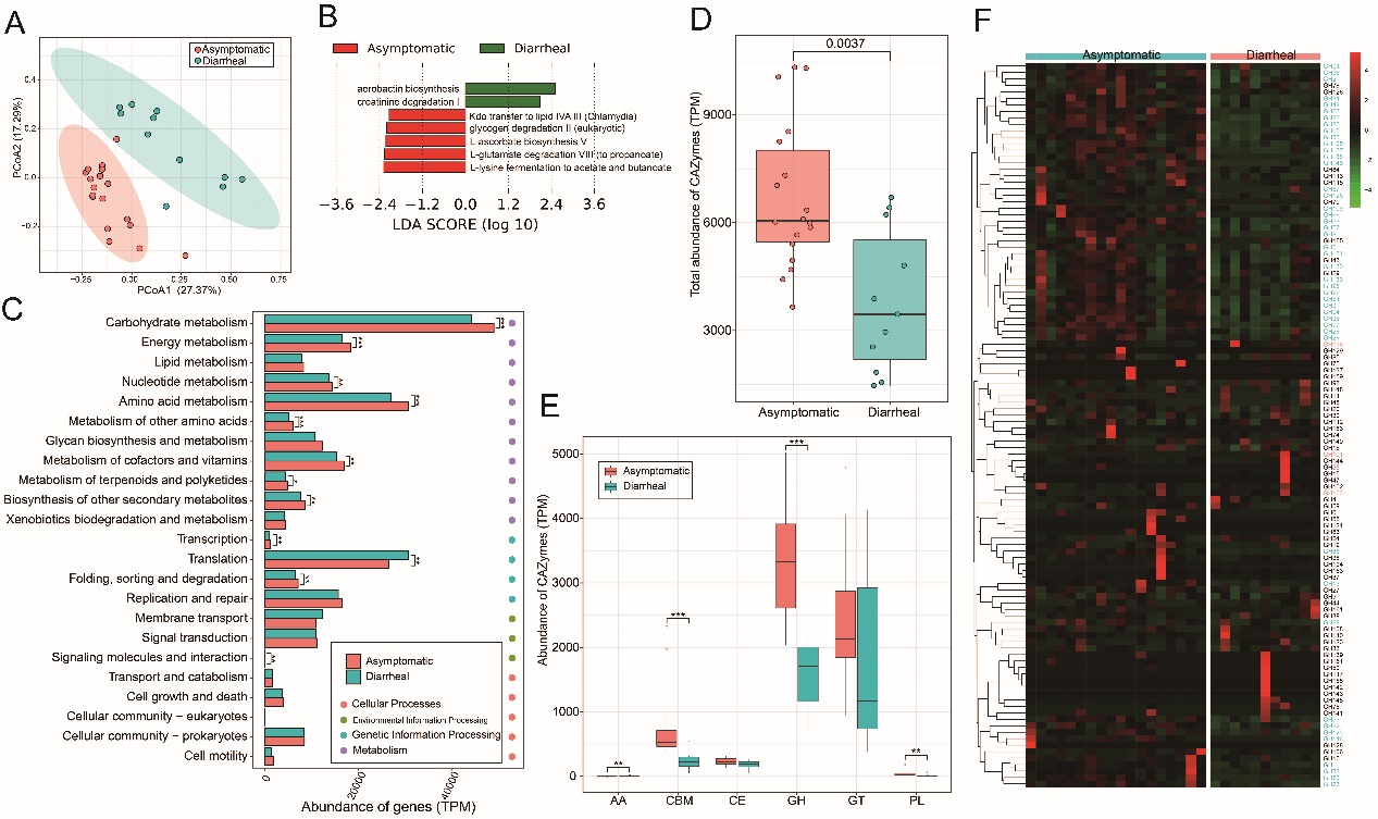 图1 慢性腹泻猕猴与无症状猕猴肠道菌群的功能比较。(A)基于基因家族丰度的Bray-Curtis距离的PCoA图(adonis, R2 = 0.19675, P = 0.001)。(B)肠道微生物代谢通路的丰度差异(p < 0.05且LDA > 2)。(C)主要的KEGG功能的比较。(D)总的CAZymes基因丰度的比较。(E)CAZymes各个家族的丰度比较。(F)主要GH家族的分布。