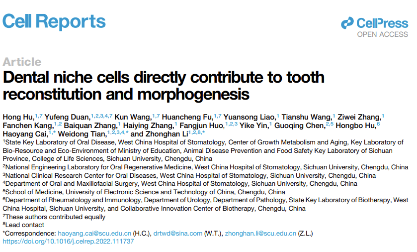 2022年12月6日,必赢3003no1线路检测中心李中瀚教授、田卫东教授、蔡浩洋教授的研究团队在Cell Reports上发表题为“Dental niche cells directly contribute to tooth reconstitution and morphogenesis”的研究论文。该研究通过单细胞测序,利用生物信息学技术,表征了从胚胎到出生后阶段(E12.5到PN7)磨牙发育过程中上皮细胞和间充质细胞的细胞动态变化,并结合DistMap方法高精度表征了在E14.5磨牙表达的基因位置。其中Sdc1被鉴定为牙乳头的特异性标记,而牙龛细胞表达其他特征基因。令人惊讶的是,体外牙胚重建和体内肾被膜移植结果显示牙龛细胞表现出比Msx1+Sdc1+牙乳头更强的牙齿诱导能力,并形成了成簇的牙齿,同时也表明Msx1+Sdc1+牙乳头细胞可以直接从牙上皮和牙齿牙龛细胞之间的相互作用中再生。在此基础上,研究人员进一步从牙龛细胞中鉴定了一组以前未被鉴定的Msx1+Sox9+细胞可能是牙乳头的细胞起源,在发育过程中迁移并取代了原始的牙原基。综合上述,该研究表结果表明牙龛细胞直接参与了牙齿的器官发育,可以为进一步开发牙齿生物工程重建新技术提供重要理论支撑。