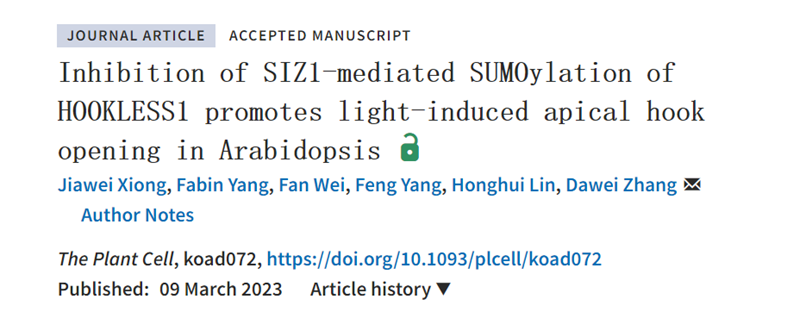 2023年3月9日,The Plant Cell在线发表了必赢3003no1线路检测中心张大伟教授团队题为“Inhibition of SIZ1-mediated SUMOylation of HOOKLESS1 promotes light-induced apical hook opening in Arabidopsis”的研究论文。揭示了SIZ1介导的HLS1的SUMO化在顶端钩发育过程中的重要作用,提出了一个将HLS1在顶端钩形成过程中的翻译后修饰与光诱导的顶端钩打开联系起来的动态调节机制。